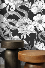 Introducing our Serpentine Floral Majesty Wallpaper, an exquisite design that artfully blends the mystique of slithering serpents with the delicate beauty of blooming flowers. This wallpaper features a stunning contrast of meticulously detailed snakes entwined amidst lush, full-petaled florals, evoking a sense of enchantment and bold elegance. The monochrome palette allows for versatile styling, complementing both modern and traditional interiors with its enduring charm. Every inch of this wallpaper is a testament to artistic finesse, designed to add a touch of sophistication to your walls. Perfect for creating an accent wall or a complete room transformation, this wallpaper resonates with those who desire a statement piece that is both daring and graceful. So whether you are refurbishing your living space, bedroom, or office, our peel and stick or traditional wallpaper options ensure an effortless installation process, promising a lasting impression that's as easy to admire as it is to apply.