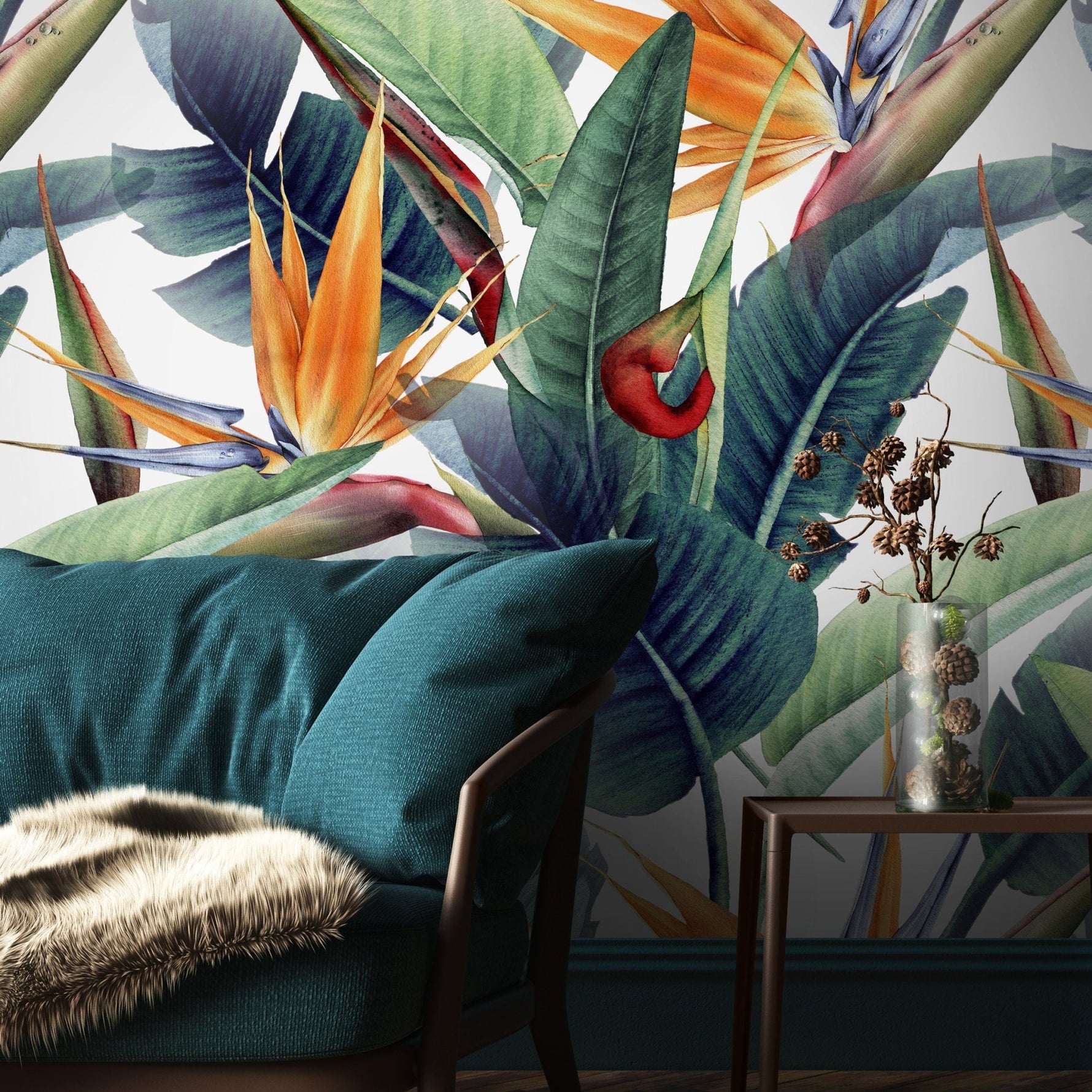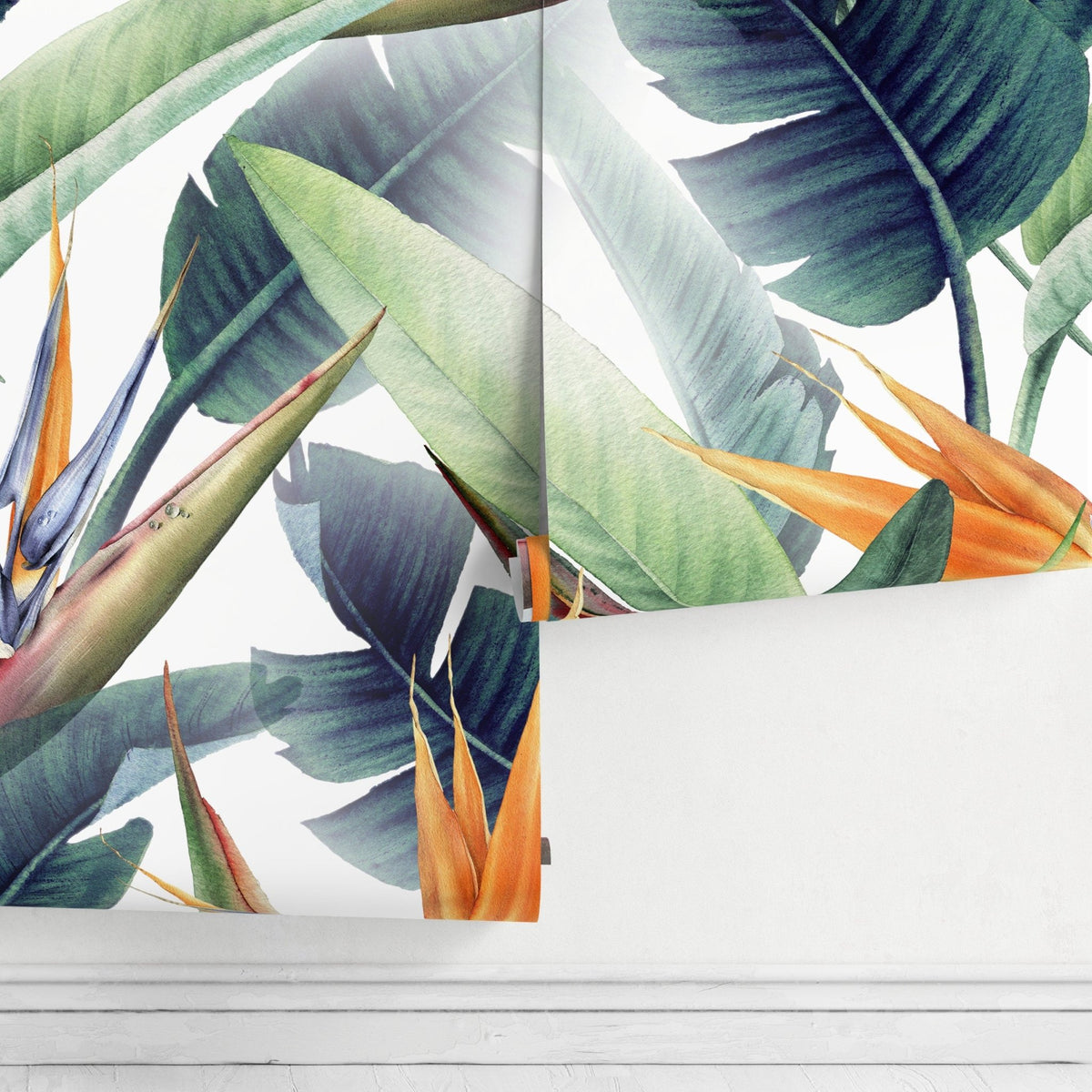 Transform your living space into a lush tropical retreat with our Tropical Paradise Wallpaper. This exquisite design boasts lifelike botanical illustrations featuring a vibrant mix of green foliage and exotic bird of paradise flowers. The radiant orange, blue, and white blooms stand out against the lush greenery, adding a touch of natural elegance to any room. Perfect for those looking to create an invigorating and serene atmosphere, this wallpaper design invites the beauty of nature indoors. Suitable for an accent wall or a complete room makeover, it is ideal for residential or commercial spaces seeking to add a dose of nature-inspired sophistication. Adhering to modern style while celebrating the timeless appeal of flora, this wallpaper offers easy installation with options for peel and stick or traditional application, catering to both renters and homeowners alike. Experience the ease of updating your decor with this stunning design, while enjoying the durability and high-quality finish that will impress for years to come.